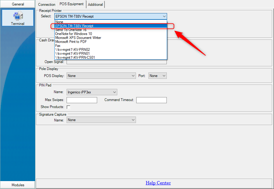 Under the Receipt Printer in a drop-down menu select the printer that was installed earlier
